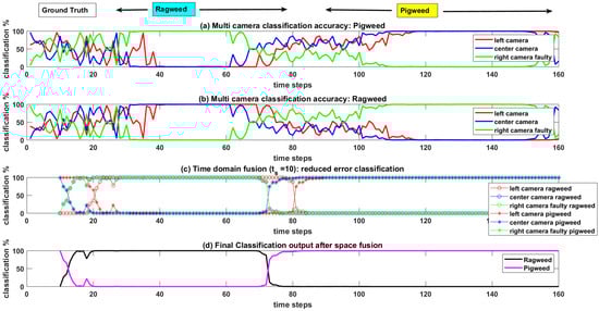 Ground truth value for Ragweed and Pigweed shown at the top. (a) Classification accuracy from left, center, and right cameras for Pigweed. (b) Classification accuracy from the left, center, and right cameras for Rigweed. (c) Stable classification output (smooth curve) with time domain fusion. (d) Eliminated the effect of faulty sensor (right camera) evidence on final classification output with space domain fusion.