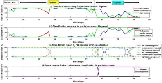 Ground truth value for Ragweed and Pigweed at the top. (a) Classification accuracy from left, center, and right cameras for Pigweed. (b) Classification accuracy from left, center, and right cameras for Rigweed. (c) Reduced classification error (smooth curve) with time domain fusion. (d) Eliminated the effect of partial occlusion on final classification output with space domain fusion.