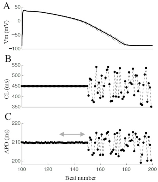 A pacing train (150 beats) at a constant BCL = 450 was simulated, during which the AP waveform reached a steady state, reported as a solid line in panel (A). After the conditioning train, CL was made to vary randomly within ± 100 ms with respect to BCL (panel (B)), and the corresponding APDs were measured (panel (C)). The average APD value during the last 25 beats of the conditioning train (double arrow) was also measured.