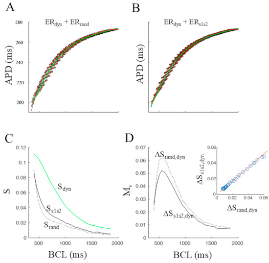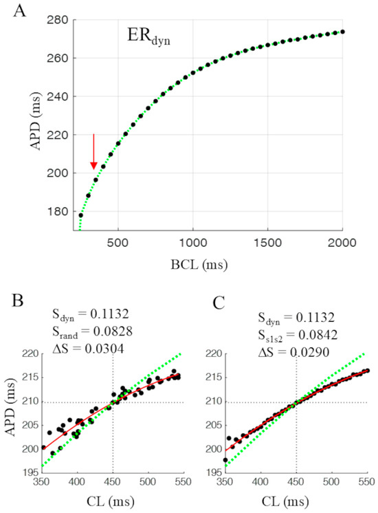 The scatter plot in Figure 2B represents ERrand, where each APD of the random sequence of Figure 1C is reported as a function of the preceding CL; data points were fitted with a parabolic curve (red in the figure; R2 = 0.94). Superimposed on the scatter plot, the corresponding segment of ERdyn is reported as a green dotted line, also fitted with a quadratic curve. The values of the slopes of ERdyn (Sdyn) and of ERrand (Srand) were measured at BCL = 450 ms and are reported in the figure together with their difference (ΔS). The black dots in Figure 2C represent the standard ERs1s2 curve (see Section 2) measured at the same BCL as in panel B, with its parabolic fitting (R2 = 0.98). Superimposed, the corresponding segment of ERdyn is in green. Slope values of ERdyn and ERs1s2 are also reported, together with their difference.