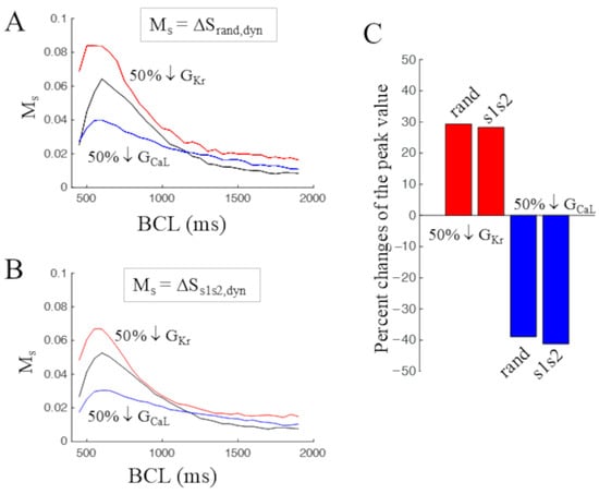 (A) The effect on the control Ms curve (black), measured as ΔSrand,dyn, of 50% reduction of the maximum conductance of IKr (red) and and ICaL (blue) is shown. (B) The same when Ms was measured as ΔSs1s2,dyn. (C) Percentage changes in the peak value of Ms under GKr reduction are reported in the two cases as red bars, and as blue bars in the case of GCaL reduction.
