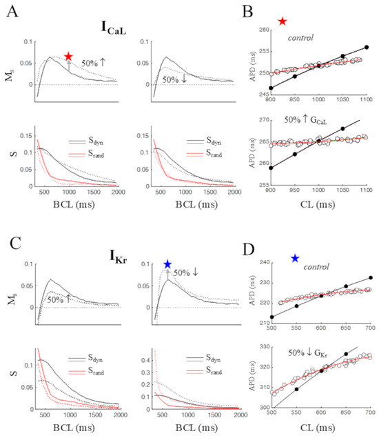 Pharmacological modulation of memory. The effect on Ms of progressively increasing (up to 75%, step 25%) or decreasing (down to −75%, step 25%) the maximum conductance of all the ion currents included in the ORd AP model was studied. The top panels of Figure 5A show the effect of ±50% changes of GCaL, which affected the peak value of Ms in the case of decrease and modified its shape, but left the peak value unchanged in the case of increase. Notably, Ms changes were mostly due to changes in Sdyn rather than in Srand (lower panels of Figure 5A). This appears more clearly in Figure 5B, where a detail of ERdyn (black) and ERrand (red) curves at BCL = 1000 ms (red star in Figure 5A) is reported in control conditions and under GCaL increase, and the angle between the two increases mainly due to the increase in the slope of the ERdyn curve (Sdyn). Figure 5C shows the effect of ±50% increasing/decreasing GKr on Ms, which led to decrease/increase the peak value of the Ms curve, leaving its shape largely unaltered. Notably, Ms reduction under GKr increase was mainly due to a decrease in Sdyn, whereas Ms increase under GKr decrease (see detail as blue star at BCL = 600 ms) was due to changes in both parameters (lower C panels and panel D).