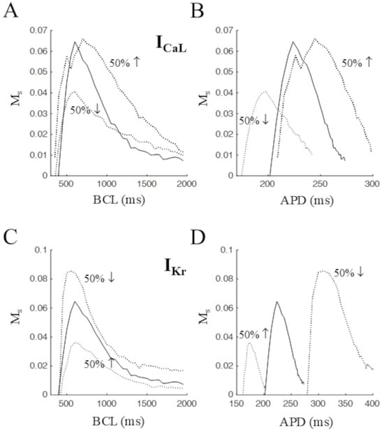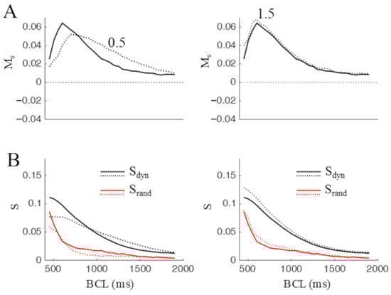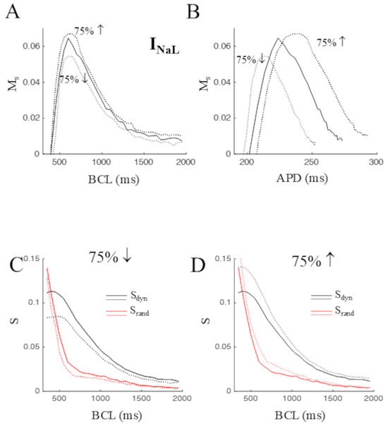 The effect of modulating maximum conductance of the late sodium current INaL was also explored, given the significant contribution of this current to AP ventricular repolarization [25]. The results are reported in Figure 7, which shows that 75% increase/decrease in GNaL led to increase/decrease the peak (same BCL) value of Ms (Figure 7A), paralleled by an increase/decrease in APD (Figure 7B). Also, changes in Ms, particularly the peak value, were mainly due to changes in Sdyn rather that in Srand (Figure 7C,D).