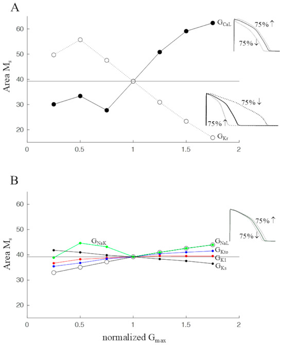 To summarize the above results and take overall Ms changes into consideration, the area underlying the Ms curve was measured for each treatment. Figure 9A shows the almost symmetrical effect that changes in GCaL and GKr had on this parameter. The insets show the effect that ±75% changes in the maximum conductance of these two currents had on the AP waveform measured at pacing BCL = 1000 ms. Changes in the area of Ms are also reported under GNaL, GKto, GK1, GKs, and GNaK modulation in Figure 9B. They had smaller and, except for GNaK, linear effects on Ms area and on APD.