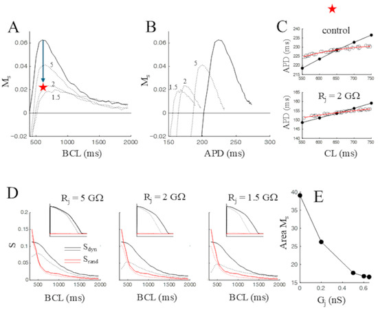 where the two equations are coupled by means of the electrotonic current, the term on the left-hand side of both equations (see for example [26]). In other words, only one of the two cells was electrically paced (Istim,1 ≠ 0 and Istim,2 = 0), and the second was electrically coupled via Rj to the source cell, only depolarized below-threshold, thus inducing an electrotonic polarization (shortening) of APD in the source cell. As Rj was made to decrease from infinite (control uncoupled condition) down to 1.5 GΩ, both the peak and area of Ms decreased (Figure 11A, numbers on figure are Rj values in GΩ). Further decrease in Rj led to near-threshold depolarizations in the sink cell, causing non-linear interactions in the cell pair, and were not considered. The overall changes of Ms area are shown as a function of Gj (1/Rj) in Figure 11E. When Ms was plotted against APD, the electrotonic shortening of APD was paralleled by a decrease in Ms peak and area (Figure 11B). Notably, the electrotonically induced decrease in Ms (red star in Figure 11A) is mainly due to a decrease in Sdyn rather than a change in Srand, which indeed remained almost constant (Figure 11C). In fact, the electrotonic load of the resting cell not only shortened the APD of the source cell, but dramatically modified the shape of ERdyn and, in turn, its slope (Figure 11D), leaving Srand nearly unchanged.