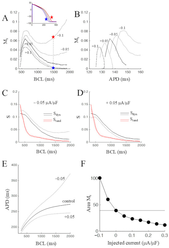 Constant current injection during pacing was simulated. (A) Ms measurements are reported for the control condition (solid line) and during constant current injection (dotted lines). Numbers in the figure are current amplitude in μA/μF. The inset shows the effect of injecting ±0.1 μA/μF on the AP elicited at BCL = 1500 ms (blue and red star, respectively). (B) Ms curves of panel A reported here as a function of APD. (C,D) Effects of constant current injecting ± 0.05 μA/μF on Sdyn (black) and Srand (red). Controls are solid lines, injected currents are dotted lines. (E) Effect of current injection of the form of ERdyn. Numbers in the figure are current amplitude in μA/μF. (F) Effect of current injection on the area of Ms curves.