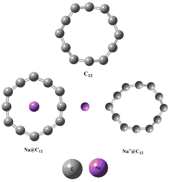 Optimized structures of the C12 nanoring and sodium atom (Na)- and sodium cation (Na+)-adsorbed C12 complexes.