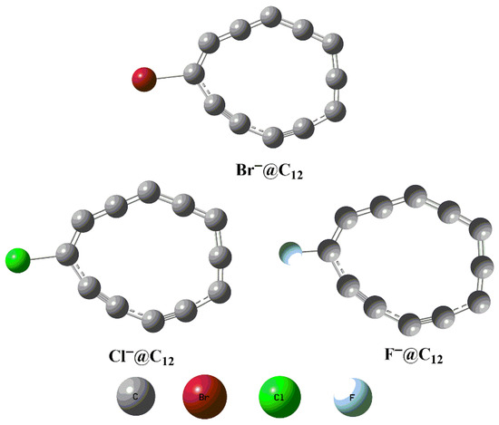 The C12 nanoring adsorbed with halogens (Br−, Cl−, and F−) by placing each halogen on four possible orientations. It was observed that for the adsorbed halogens on the C12 nanoring, the most stable position is at one side of the carbon. After optimization, the bond distance between C and Br− is 1.93 Å in the Br−@C12 complex. The bond distance between C and Cl− is 1.78 Å., and in C12 and F−, the bond distance is 1.37 Å. Optimized geometries are presented in Figure 2. Adsorption of Br− with the C12 nanoring shows stronger interaction as it is reflected through the interaction energy value of −50.32 kcal mol−1. In the case of Cl−, the interaction energy is −47.95 kcal mol−1, and the strongest interaction is observed in the case of F− with C12 (−84.79 kcal mol−1). Researchers have observed strong interaction between halogens and carbon-based materials and their uses in secondary batteries, as we observed in the current study [87].