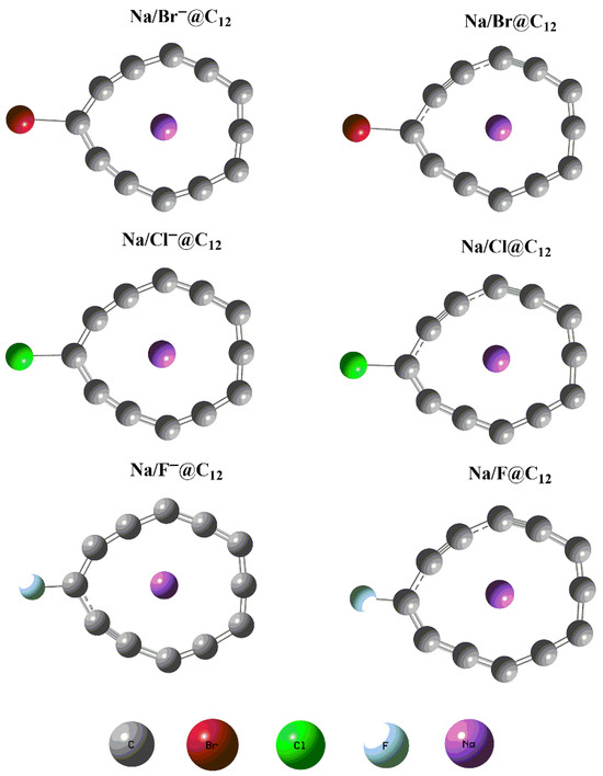 Optimized structures of Na/Na+ adsorbed on halide (Br−, Cl−, and F−)-adsorbed C12 complexes.