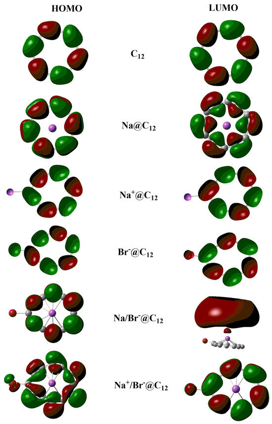 Frontier molecular orbitals such as HOMO and LUMO of pure C12, Na@C12, Na+@C12, Na/Br−@C12, and Na+/Br−@C12.