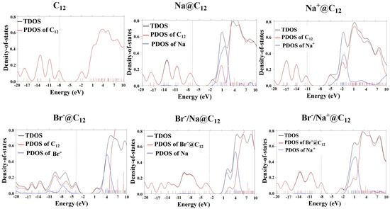 Partial density of states (PDOS) and total density of states (TDOS) of the pure Na/Na+-adsorbed C12 nanoring and the Na/Na+-adsorbed Br−@C12 complex.