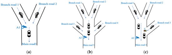 The three complex scenarios considered in this paper. (a) Y-shaped road; (b) The 4-branchs road; (c) The 3-branches road.