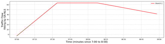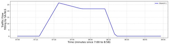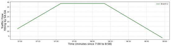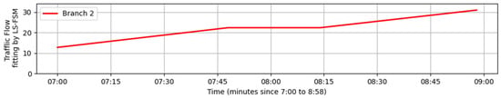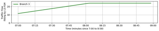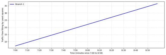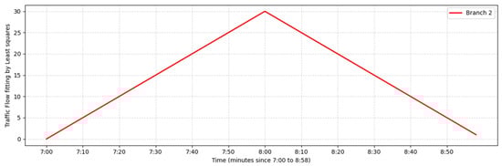 According to the historical traffic flow observation records, during the period of [6:58, 8:58], the traffic flow on Branch Road 1 showed a linear growth trend, while that on Branch Road 2 exhibited a trend of linear growth first and then a linear decrease. For the empirical traffic flow data in the third column in Table A1 of Appendix A, we implemented a least squares curve fitting model [,,,] to reconstruct branch road traffic flows. Python 3.9 was utilized for algorithm implementation. Software implementation details include the least squares method coded in Python with NumPy (1.26.3) for matrix operations and SciPy (1.13.1) for optimization. Specifically, linear regression and piecewise linear models were developed for Branch Road 1 and Branch Road 2. The branch fitting formulas are shown in Equations (1) and (2). The resulting fitted curves are shown in Figure 2 and Figure 3, where RMSE is 0.0000, MAE is 0.000, and MAPE is 0%. Visualization of the main road traffic flow reveals an approximately linear trend. Consequently, the linear model for Branch Roads 1 and 2 achieves an RMSE of 0, indicating negligible overfitting. The fitted values of main road traffic flow align closely with observed data, demonstrating high model fidelity.