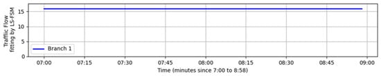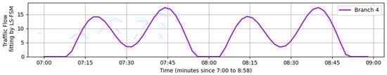 We obtain the fitted results and shown in Figure 3, Figure 4, Figure 5, Figure 6 and Figure 7, where RMSE is 3.6526, MAE is 3.0606, MAPE is 86.10%, PSI is 0.0861 under a 3% perturbation of the parameter, SSS is 99.68% with time delay compensation, and RMSE is 3.8152 without time delay compensation. Incorporating a 2 min time delay compensation significantly enhances model accuracy, as the resulting temporal patterns of branch road traffic flows demonstrably align with empirical traffic behavior. Residual analysis via the fast Fourier transform (FFT) method revealed no significant spectral peaks exceeding the statistical threshold (49.6105), confirming that the second-order expansion sufficiently captured inherent periodicity without higher-order terms.
