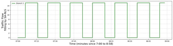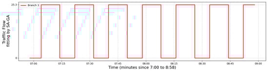 In the GA–SA model, we set the population size to 15, the uniformly sampled mutation rate from 0.5 to 1.0, the crossover rate at 0.7, the initial temperature to 5230, and the restart temperature ratio to , after adjusting the parameters. In RPCA model, we set the regularization coefficient to . Software implementation details can be seen in Table A2 The branch fitting formulas are shown in Equations (12)–(14). The GA–SA model displays the best effect, and the result is shown in Figure 11, Figure 12 and Figure 13. Meanwhile the green light first commenced at 7:06 (t = 3). In the GA–SA model, RMSE is 13.6733, MAE is 2.8329, MAPE is 7.42%, PSI is 0.0184, SSS is 99.89% under a 3% perturbation of the parameter with time delay compensation, and RMSE is 4.6824 without time delay compensation. The error indexes and model stability indexes for NLS and RPCA are shown in Table A2 of Appendix B.