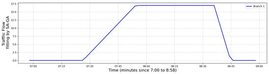 We employ three parameter optimization methods: constrained least squares, a hybrid genetic algorithm–simulated annealing (GA–SA) approach [,,,,,,,], and robust principal component analysis (RPCA) [,,]. The hybrid GA–SA model was ultimately selected to characterize branch road traffic flows using the dataset in the sixth column in Table A1 of Appendix A. This hybrid algorithm enhances the classical simulated annealing framework by integrating the population-based search mechanism of genetic algorithms. The resulting optimizer combines probabilistic state transitions with global population search capabilities. In traffic monitoring applications, main road sensors may generate sparse yet high-amplitude errors due to network delays or equipment failures, resulting in sudden data drops. While the GA–SA hybrid fits functional traffic models, RPCA effectively isolates such anomalies while preserving the underlying low-rank traffic matrix structure.