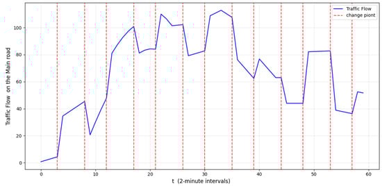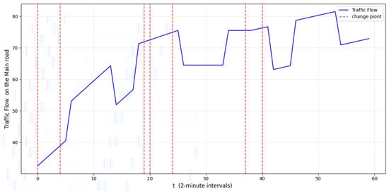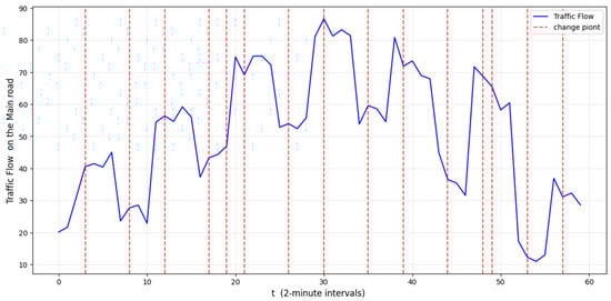 Furthermore, to determine function parameters, sufficient data points surrounding these key time points are required. Therefore, change point detection [,] is employed to identify optimal segmentation intervals. Specifically, the PELT algorithm [] is applied to the main road traffic flow time series to detect significant change points.
