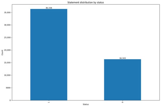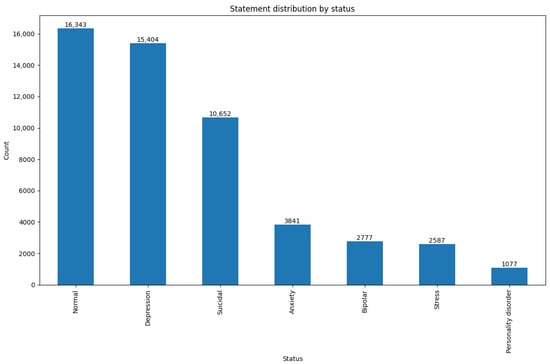 To illustrate and implement these practices, we employ the ‘Sentiment Analysis for Mental Health’ dataset available on Kaggle (https://www.kaggle.com/datasets/suchintikasarkar/sentiment-analysis-for-mental-health/data, accessed on 23 November 2024). This dataset is not associated with any competition and does not have a leaderboard. It is selected for demonstration purposes, as it aggregates posts from multiple social media platforms and includes a range of mental health categories such as depression, anxiety, stress, bipolar disorder, and personality disorder. Its diversity makes it suitable for exploring both binary and multi-class classification scenarios, and for highlighting practical issues encountered in real-world data.