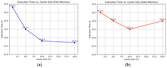 To evaluate the efficiency of the Working Set algorithm compared to FIFO and LRU, we conducted simulations on a 10-node FPGA-based system using randomized memory access patterns. Each node executed 100,000 memory operations, with 80% being local accesses and 20% remote. Performance was assessed through average page fault time, page fault frequency, and total execution time. The superior performance of WS likely stems from its ability to maintain a set of actively used pages, adapting even to random access patterns. LRU and FIFO, while effective in workloads with locality, offer little advantage here, and the lack of pattern consideration makes them the least efficient. We varied the cache size to 1%, 5%, 10%, and 20% of total memory using the Working Set algorithm, sourcing memory from both free reserves and data memory (overflow). As the cache size increased from 1% to 10%, the page fault frequency dropped from 39% to 33%, and the total execution time decreased from 14.8 s to 12.8 s, as shown in Figure 1a. Beyond 10%, at 20%, the frequency stabilized at 32%, and execution time plateaued at 12.7 s, indicating diminishing returns. Average page fault time remained steady at around 6 µs across all sizes. With data memory caching, fault frequency decreased from 38% at 1% to 30% at 10%, with execution time improving from 14.5 s to 13.5 s. However, at 20%, execution time rose to 14 s despite a frequency of 29%, as reduced data memory led to more frequent evictions and reloads, as shown in Figure 1b.
