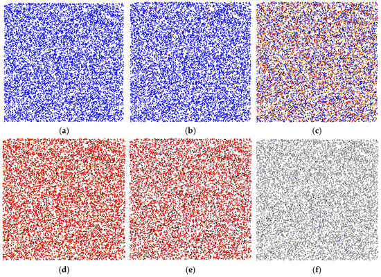 Stages of epidemic spread in the adaptive WS model for 100 days, considering five types of agents with a total population of 10,000 agents: Blue dots represent susceptible agents, orange dots represent infected agents, red dots indicate super-spreaders (highly infectious agents), black dots represent isolated agents, and gray dots represent recovered agents. (a) Initial stage: a very small infected fraction and no isolation yet; (b) Early growth: more infections and first isolations and super-spreaders emerging (around day 10). Local clusters form around super-spreaders; (c) First recoveries (gray) appear after isolation, susceptible count declines by day 36; (d) Peak stage (day 59): susceptible—0.2%, infected—12%, super-spreaders—51%, isolated—26%, recovered—10.8%. Intensive isolation—38%, is applied to curb the peak; (e) Late stage (day 65): infections decline—5% infected, many super-spreaders—41%, among remaining infected, isolation still significant—21%, recovered—32%; (f) Final stage: infection disappears and nearly the entire population transitions to the recovered state by day 100. Super-spreaders contribute disproportionately to early epidemic growth, but effective isolation eventually contains it.