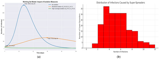 In this work, we adapt the Working Set concept from computer science for epidemiological modeling. In the adapted WS model, agents actively transmitting the disease are removed from the working set (i.e., isolated), thereby reducing opportunities for further spread. In effect, the WS algorithm helps identify potential super-spreaders [34], infected agents who would otherwise transmit infection to an unusually large number of susceptibles. Notably, real-world outbreak data suggest that a small minority of infected people can be responsible for the majority of transmissions. For example, approximately 19% of COVID-19 cases were estimated to cause 80% of local transmissions in one analysis, underscoring the importance of identifying and isolating such high-transmission agents [35]. Unlike classical SIR and SEIR models, our adaptive WS model explicitly accounts for dynamic isolation and variable transmission rates that depend on the current active contact set size. Numerous studies have shown that timely isolation and quarantine are critical for controlling epidemics [36,37,38]. These measures prevent disease spread, protect vulnerable groups, allow time for case detection and treatment, reduce burdens on health systems, facilitate contact tracing, and have proven historical effectiveness. Despite the social and economic costs of strict isolation policies, their public health benefits are significant, making isolation and quarantine integral components of epidemic response strategies.