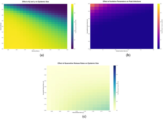 Figure 5a shows the final outbreak size as a function of the infection rate and the recovery rate . The heatmap shows that as increases (moving right on the plot) or decreases (moving down), the epidemic infects a larger portion of the population. Conversely, higher recovery rates or lower transmission rates confine the epidemic to a smaller size (lighter regions). This aligns with classic model expectations, faster recovery or lower transmissibility leads to fewer people ultimately infected. The WS model framework reproduces these dependencies and allows us to quantify how intervention success might vary with different pathogen characteristics. Figure 5b shows the impact of the isolation rate for infected agents on the peak number of infections. The heatmap illustrates that increasing the isolation rate of infectious agents markedly reduces the peak prevalence of infection. In other words, the more aggressively and quickly infected cases are isolated, the lower the highest burden on the population at any given time. However, this panel also implicitly reflects the diminishing returns and trade-offs of extremely high isolation levels. Implementing very strong isolation for a large portion of the population can indeed nearly eliminate transmission, but at the cost of significant social disruption. In practice, strong isolation and quarantine policies have been shown to reduce strain on health systems by preventing surges of cases [48,49,50], but they may also entail substantial economic and societal costs [51]. Our model’s sensitivity analysis aligns with these real-world observations: while perfect isolation of all infectious agents is the optimal way to suppress an epidemic, it may not be fully feasible to achieve. Thus, public health policies must balance the isolation rate with the resources available and the indirect effects on society. Figure 5c shows the effect of the isolation release rate on epidemic outcomes. This heatmap examines how quickly releasing people from quarantine influences the epidemic. A fast release means agents spend less time in isolation; if someone were infectious, they could re-enter the working set sooner and potentially spark new transmissions. Therefore, as Figure 5c suggests, very high release rates can lead to larger epidemics. On the other hand, a slow release keeps potentially infectious agents out of circulation for longer, aiding in control but requiring more isolation resources. In summary, this trade-off implies that while prolonged isolation is epidemiologically beneficial, it must be weighed against practical constraints like quarantine capacity and agents’ willingness to remain isolated.