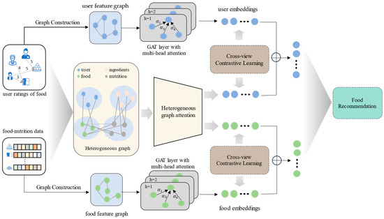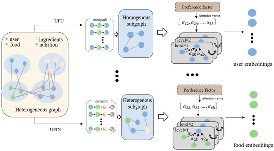 Traditional recommendation methods achieve personalized recommendations by mining explicit or implicit interaction data between users and items [6,7]. The most representative methods include collaborative filtering (CF) and content-based recommendation. CF generates recommendations by analyzing users’ historical behavior data to uncover similarities in user interests or correlations between items. However, this method relies on sufficient historical data and faces challenges, such as the cold-start problem and data sparsity [8,9]. Content-based recommendation generates recommendations by matching item attributes (e.g., text descriptions, category labels, or nutritional contents) with user interests, thus mitigating the cold-start problem in CF [10]. However, this method often suffers from a lack of diversity in the recommendation results (i.e., the “filter bubble” phenomenon) and is unable to fully utilize collaborative information between users [11]. Moreover, traditional recommendation methods rely too heavily on domain knowledge, making it challenging to comprehensively model complex user behaviors and item information [12]. Especially in food recommendations, recommendation systems need to integrate multi-dimensional heterogeneous information from both users and foods. Traditional methods show significant short-comings in handling such complex relations. In recent years, graph neural networks (GNNs) have made significant progress in recommendation systems, especially in food recommendation, which requires integrating multi-dimensional heterogeneous information in complex scenarios. Early research focused mainly on recommendation methods for homogeneous graphs [13,14,15], where recommendations were generated by aggregating node features in the user–food interaction graph to model the similarity both between users and between foods. However, these methods have limitations in handling recommendation scenarios that involve multiple types of heterogeneous information and fail to fully represent the heterogeneity between nodes and edges. To address this issue, researchers have begun applying Heterogeneous Information Networks (HINs) to recommendation systems [16,17,18]. Unlike homogeneous graph methods, HINs can flexibly model complex relations between nodes (e.g., users, food, ingredients) and various relations (e.g., user preferences, food components). Additionally, meta-paths are introduced in HIN to capture specific semantic relations in the heterogeneous graph [16], revealing potential connection patterns between nodes by defining specific node-edge sequences. However, meta-path design requires domain knowledge, and different meta-paths have varying importance for node embedding representations. To overcome these challenges, meta-path-based Graph Attention Networks (GATs) have been proposed to dynamically assign weights to meta-paths with different semantics, thereby improving the performance of recommendation systems [19,20].