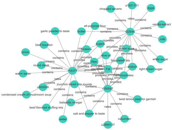 We construct a user–food heterogeneous information network using the Allrecipes dataset for the heterogeneous information connection graph. This network consists of four types of nodes (user, food, ingredient, and nutrition) and three types of edges (user–food, food–ingredient, and food–nutrition). For example, when a user rates a particular food, a link forms between the user’s node and the food’s node. Similarly, if a food is composed of specific ingredients, connections are formed between them. Additionally, food nodes are connected to their corresponding nutritional data nodes. Table 2 summarizes the node types, edge types, and their semantic relations in the heterogeneous information network.