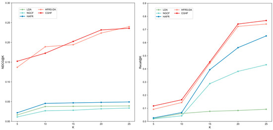 Here, represents the list of the top K recommended foods. is the health score of the recommended food . is the average health score of all the recommended foods. represents the total number of healthy foods. To obtain experimental results for different recommended list sizes, we conducted multiple calculations of various metrics under different values to ensure the reliability of the experiment.