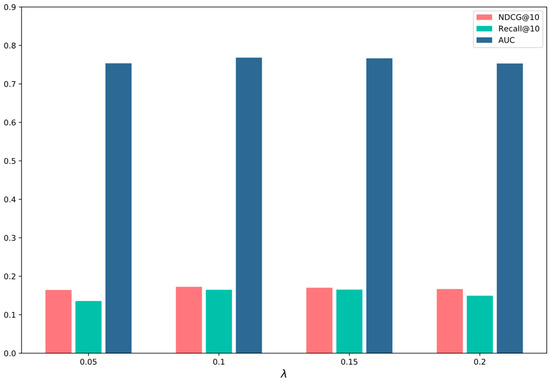 To validate the hyperparameters’ influence on the model, we tried various values of them, as shown in Figure 6. It can be observed that as the health weight increases, the model focuses more on the healthiness of the recommended food. However, as the health weight continues to increase, the accuracy of the recommendation descends gradually. When it equals 0.1, the model achieves optimal performance, indicating its capability to recommend food by properly balancing user preferences with dietary health.
