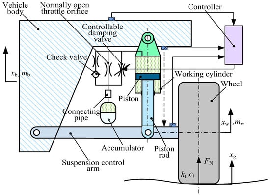 With the development of modern vehicle electronic control technology, controllable suspension systems can adapt to different road surfaces and vehicle conditions, breaking the inherent limitations of traditional suspension systems and showing broad application prospects. In various driving conditions such as steering, acceleration, and braking, an active suspension system can not only improve ride comfort but also limit the roll and pitch movements of the vehicle body in both transient and steady states. However, active suspension systems have shortcomings such as high cost and large energy consumption, which restrict their application in commercial vehicles. Compared with active suspension, semi-active suspension has great potential in improving ride comfort and maneuverability, and balances cost and performance well. At the same time, semi-active suspension also has a certain fault-tolerant capability. Once the control system fails, it can still work like passive suspension [,].