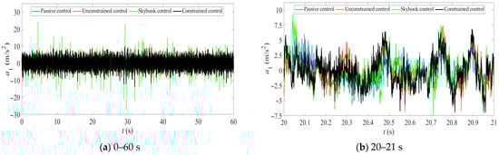 Figure 3, Figure 4, Figure 5 and Figure 6 show the simulation results of the four control methods when the vehicle is traveling on a Class D road at 20 km/h. In Figure 3 and Figure 4, (a) represents the simulation results from 0 to 60 s; (b) represents the simulation results from 20 to 21 s. In Figure 5 and Figure 6, (a) represents the simulation results within the range of 0 to 35 Hz; (b) represents the simulation results within the range of 0 to 6 Hz. Subgraph (b) clearly shows the differences between the four control results. ·