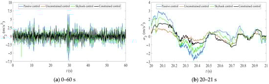 Time-domain response of sprung mass acceleration under four control methods. (a) simulation results from 0 to 60 s, (b) simulation results from 20 to 21 s.