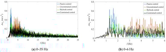 Amplitude spectra of unsprung mass acceleration under four types of control. (a) simulation results from 0 to 35 Hz, (b) simulation results from 0 to 6 Hz.