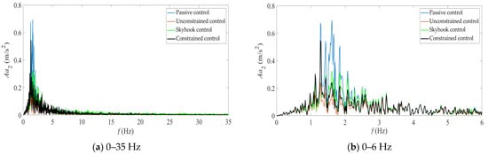 Amplitude spectra of sprung mass acceleration under four types of control. (a) simulation results from 0 to 35 Hz, (b) simulation results from 0 to 6 Hz.