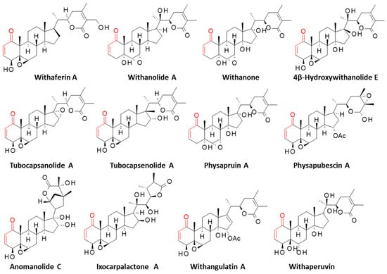 - Bailly, C. Covalent binding of withanolides to cysteines of protein targets. Biochem. Pharmacol. 2024, 226, 116405. [Google Scholar] [CrossRef]