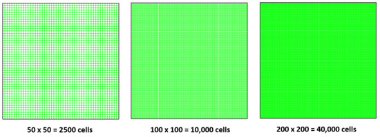 The grid test was carried out for a two-dimensional model. Three different grid systems were tested for accuracy (Figure 2). Each time, the edge intervals of the grid were doubled. The three grid systems had 50 × 50 cells, 100 × 100 cells, and 200 × 200 cells. The case was run for 17,280 time steps, with 5 s considered for each time step. This is equivalent to one full day. A second day was run as well to avoid initial condition effects. The average surface temperature on the right side was monitored and printed at each time step. This parameter was taken as a measure of grid independence.