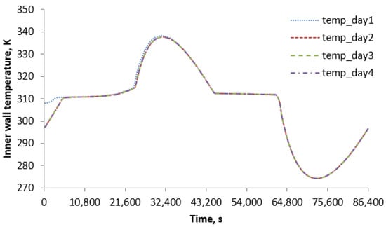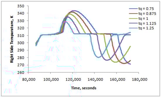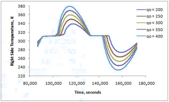 Figure 7 shows the right-side surface heat flux over a full day for different heat flux gains from the left side. It can be easily concluded that higher heat flux gain from the left side results in higher surface heat flux on the right side. The increased rate of right-side surface heat flux is almost proportional to that of heat flux gain from the left side.