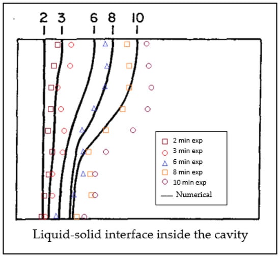 Our model has to subsequently be validated by comparison to existing experimental results from the literature. For example, Gau and Viskanta [44] studied the melting and solidification of pure metal experimentally on a vertical wall. They used a rectangular test cell that was 8.89 cm in height, 6.35 cm in width, and 3.81 cm in depth. The front and back walls were insulated with air gaps. The horizontal temperature distribution in the central region along the top wall, center line, and bottom wall was measured with 69 nested Ththermtheocouples. The PCM used was Gallium with 99.6% purity. Gallium is highly anisotropic. In our numerical model, we used a close-to-average constant thermal conductivity for Gallium. Table 5 shows the properties for Gallium that were used in our model [45]. The researchers used the pour-out method and the probing method to examine and measure the solid–liquid interface.