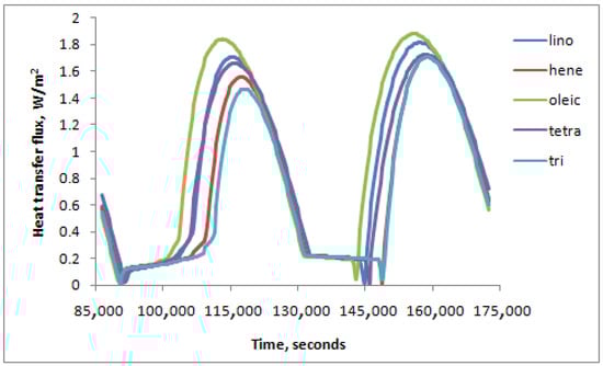 Figure 5 shows the right-side surface heat flux over a full day for different PCMs. It is obvious that Linoleic Acid provides the highest right-side surface heat flux while Tricosane provides the lowest. This could be explained by Linoleic Acid having the lowest melting temperature and the second-lowest heat diffusion ΔHf (in kJ/kg), while Tricosane has the second-highest melting temperature and the highest heat diffusion ΔHf (in kJ/kg). The heat transfer during the cooling period is taken as the absolute value. This is carried out to have correct efficiency calculations, and it is carried out for the right-side surface heat flux throughout the rest of this paper.