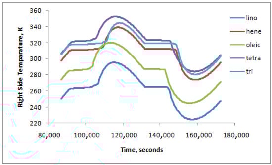 Figure 6 shows the right-side average surface temperature over a full day for different PCMs. Each PCM has its own melting temperature, and cases were run at initial and ambient temperatures 4 °C below its melting temperature. Liquidus and solidus temperatures are chosen to be 0.5 °C above the melting temperature. The properties of all PCMs used in this section are given in Table 6 [45]. Viscosity and thermal expansion are taken as 0.008 kg/m·s and 0.0005 K−1, respectively, for all PCMs. The heating of the liquid and the cooling of the solid can be seen easily with melting and solidification in between phases. The slight edge shown at the start of the second day is because the solid is reheated from the previous day.
