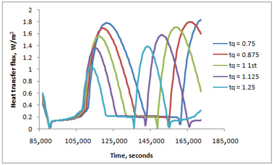 Figure 9 and Figure 10 show the right-side surface heat flux and average surface temperature over a full day for different daytime hours, respectively. Longer daytime hours will expose the left side of the enclosure for a longer time to the heat flux gain from the left side, causing a change in melting and solidifying durations. A piecewise sinusoidal function was implemented to model different daytime hours during a full day, as shown in Equation (2). In the case of longer days (τq < 1), the PCM was in liquid form for a longer time but in solid form for a shorter time. In this case, the PCM stays in solid form towards the end of the day, which means that the next day will start while it is in solid form with low temperature. In case of shorter days (τq > 1), the PCM was in liquid form for a shorter time but in solid form for a longer time. In this case, it starts to liquidize again towards the end of the day.