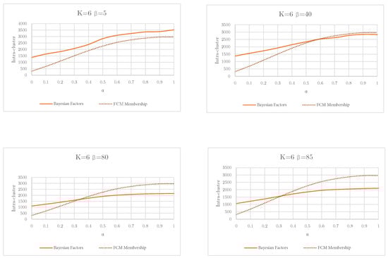 The analysis of membership evolution based on the overlap parameter () is further detailed in Table 1, highlighting critical insights into clustering behavior once the optimal number of clusters (k) was determined. Notably, the table demonstrates a clear inverse relationship between the overlap parameter () and the fuzzy exponent parameter (a) across different cluster sizes (). As the fuzzy exponent parameter (a) increases, cluster overlap consistently decreases, indicating that clusters become more exclusive and compact. Furthermore, the Bayesian model consistently yields lower overlapping values compared to FCM at identical exponent levels (a), particularly noticeable for larger values of k, underscoring Bayesian NMF’s robustness in defining well-separated clusters. These patterns indicate that optimal predictive performance is closely associated with moderate-to-high levels of cluster overlap, confirming Bayesian NMF’s ability to effectively model realistic user–item interactions characterized by multiple overlapping preferences, especially relevant in sparse recommendation scenarios.