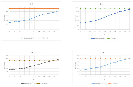 The evaluation of hard-clustering methods included comparisons between classical Matrix Factorization (CMF) and Bayesian NMF, specifically analyzing intra-cluster cohesion across varying numbers of clusters (). The results are presented in Figure 3.