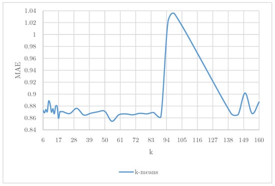 Predictive accuracy (MAE) of K-means clustering for different cluster sizes (k).