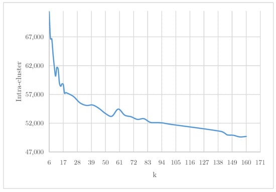 Further, Figure 4 compares predictive accuracy for different values of cluster numbers (k) in the K-means algorithm. The figure indicates that K-means does not achieve competitive predictive performance, maintaining relatively high MAE values across different cluster sizes. Figure 5 complements these results by displaying intra-cluster cohesion for various cluster numbers (k), illustrating that while intra-cluster cohesion improves with increasing k, the corresponding improvement in predictive accuracy remains limited.