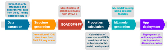 Due to their complexity and ability to fine-tune properties, ionic liquids are especially well-suited for atomistic calculations. Methods like DFT are commonly used to explore the electronic structure and chemical behavior of their components. These calculations offer insights into charge distribution, molecular orbitals, hydrogen bonding, and interactions between ions [26,27,28]. DFT calculations are also helpful for quantifying properties such as dipole moments, polarizability, electrostatic potential maps, and binding energies between cations and anions [29,30,31]. These electronic-level descriptors are crucial for understanding how subtle variations in ion structures affect macroscopic properties, such as viscosity, conductivity, and thermal stability. In addition, DFT-derived data often serve as the basis for developing machine learning (ML) models, providing a consistent and reproducible way to represent molecular systems numerically.