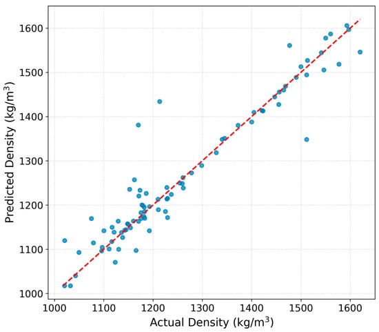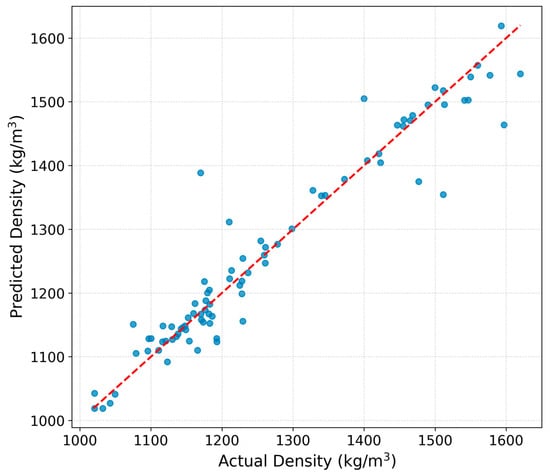 The IonIL-IM-D1 model presented excellent predictive performance on the independent test set. Namely, it achieved an of 0.906, a mean absolute error (MAE) of 28.352, and a root mean square error (RMSE) of 49.803. These results demonstrate the ability of this model to estimate IL density from molecular descriptors accurately. Robustness was confirmed through repeated cross-validation (5 folds × 10 repeats), yielding a mean of 0.835 with a standard deviation of 0.0575 across 50 folds. The final tuned SVR used an RBF kernel with , , and . Together, these results indicate the model’s reliability and suitability for high-throughput screening and rational design of ILs.