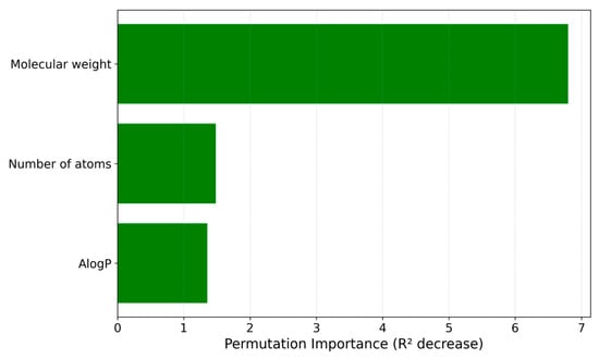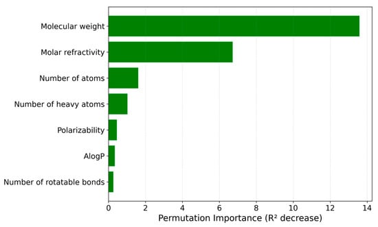 Permutation-based importance results revealed that molecular weight is the dominant feature, having the most significant influence on the density predictions of the model. This is consistent with the fundamental role of molecular mass in determining volumetric packing and density in ILs.