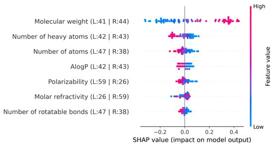 AlogP displayed SHAP values centered around zero, with a balanced distribution of positive and negative effects depending on the compound, indicating a subtle and context-dependent contribution related to hydrophobicity and polarity. Polarizability contributed slightly to the decrease in density predictions, suggesting that highly polarizable molecules may have less efficient packing due to their ability to distort and interact. Molar refractivity showed some small positive SHAP values, which indicates that structures with higher refractivity may favor stronger cohesive interactions and enhanced packing, thereby marginally increasing density. The number of rotatable bonds exhibited SHAP values tightly located around zero, which indicates a limited direct role in density prediction. However, it may still interact indirectly with other structural features.